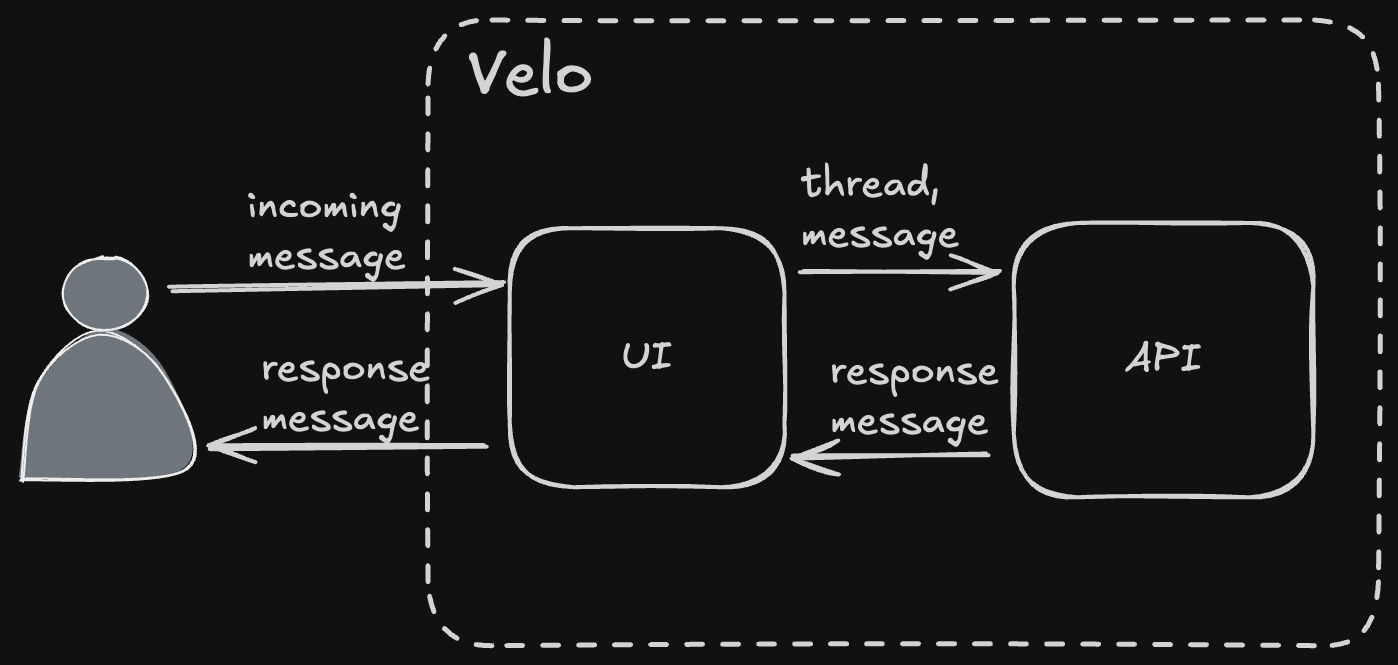 At the highest possible level, Velo™ is a message processing system. It receives messages and produces messages in response. An incoming message can come from a user either directly (free text), or from a button press ("Remind me later"). Response messages are produced by agents (more on that in a minute). The incoming and response messages are organized into threads. That's all straightforward, pretty much exactly what you get for any chat-based system like ChatGPT or Cursor.