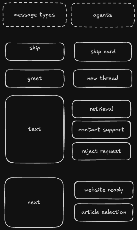 This message comes directly from the user typing their question and sending it; those have message type "text". First, the handler hydrates the thread with the rest of the messages in it. This allows callers to only send new messages rather than maintaining the thread themselves. After that, the handler fetches the entitlements associated with the business (cached most of the time) and uses those to query for available agents.