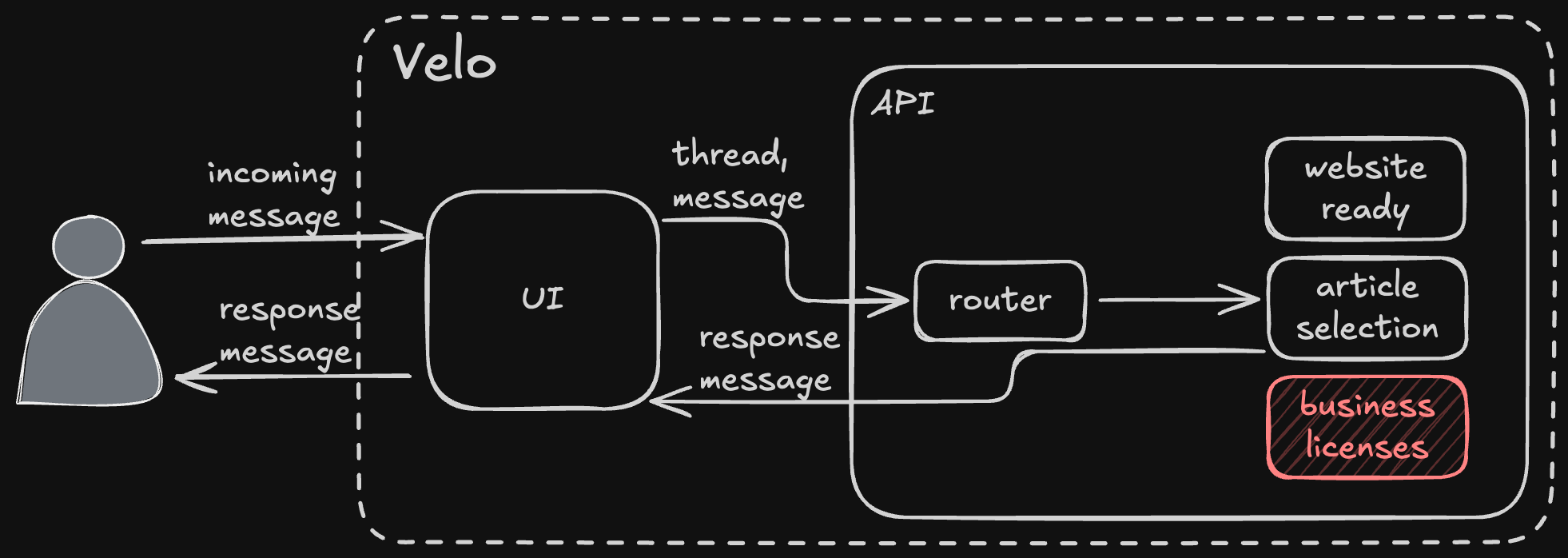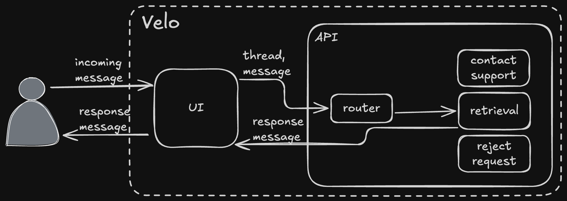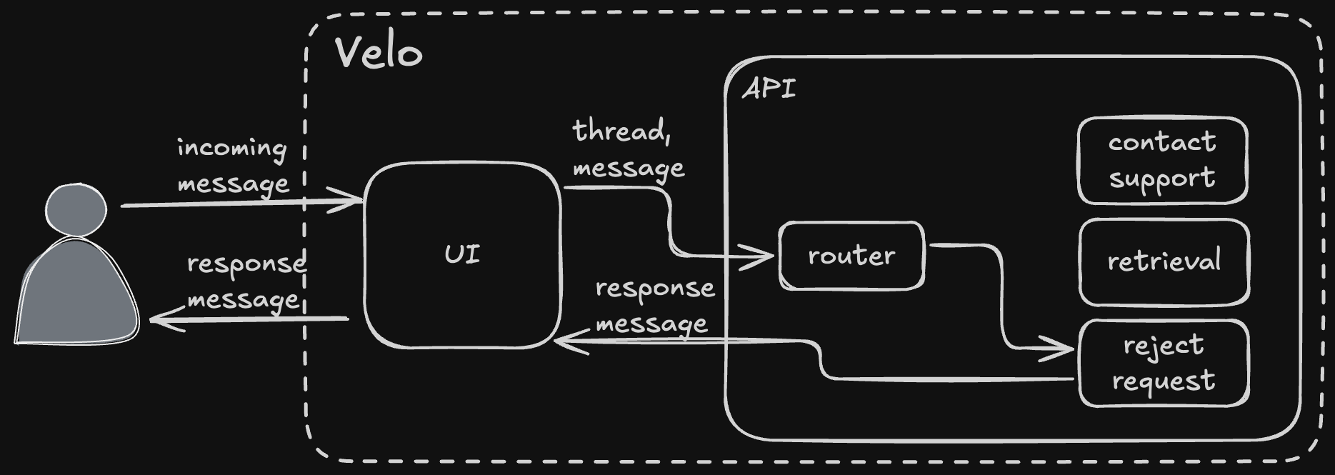 - Velo's router receives the message thread and selects an agent (via both hard rules and LLM tool calling) to answer it.