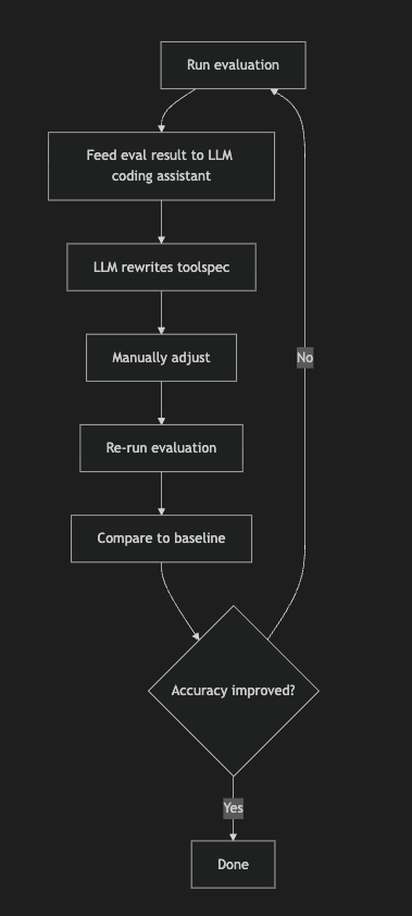 - iterate on the toolspec by feeding the eval run results back to LLM